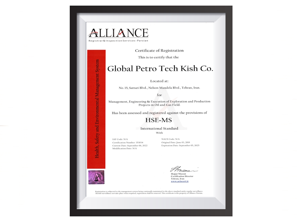تعهد شرکت گلوبال پتروتک کیش در بهبود کیفیت و حفظ استانداردهای محیطی و ایمنی در فعالیت‌هایش، از طریق دریافت گواهینامه‌های IMS قابل توجه است. این گواهینامه‌ها به‌عنوان شاهدی بر تعهد سازمان نسبت به مدیریت کیفیت، مسئولیت زیست محیطی، بهداشت و ایمنی شغلی و پاسخگویی به نیازهای ویژه‌ای که در صنعت موردنیاز است، عمل می‌کنند.